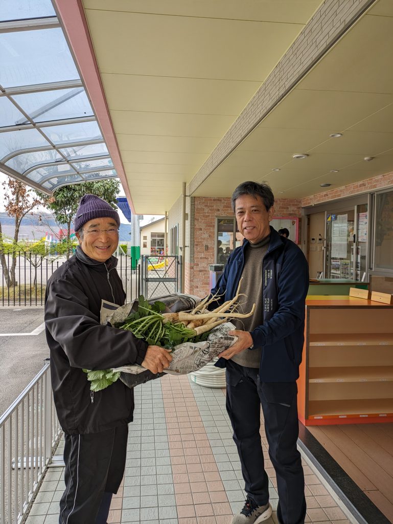 3月31日に、佐藤さんと藤川さんが、採れた6~7本の大根を隣のこども園にあげました。大根は、掘り出し時期を逸してしかも細かったので良品から遠いものでしたが、「職員の人で欲しい人がいると思います、。ありがとうございます」と、受け取っていただきました。あまり良くない大根だっただけにどこまで喜んでもらったか分かりません。しかしながら、お互いにハピーな気分になったことは確かです。また、何か採れたら持っていきますね!