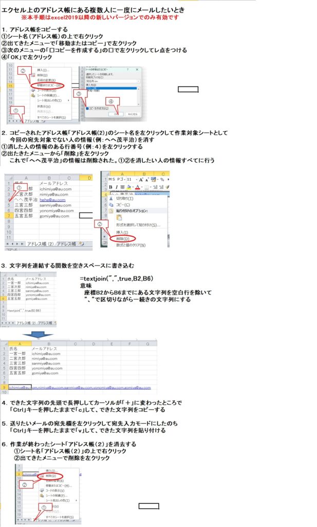 次の手順でエクセルのアドレス帳から複数のメールアドレスがカンマ”、”で区切られた文字列を作って、メールの宛名欄にコピーします。